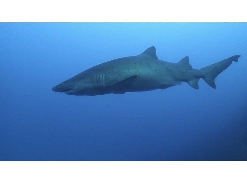 しかも、いつもは深場に探しに行くシロワニが、なんとなんと水深20mよりも浅場で見れて、しかも6個体ぐらいがパレードしてくれるという奇跡が!