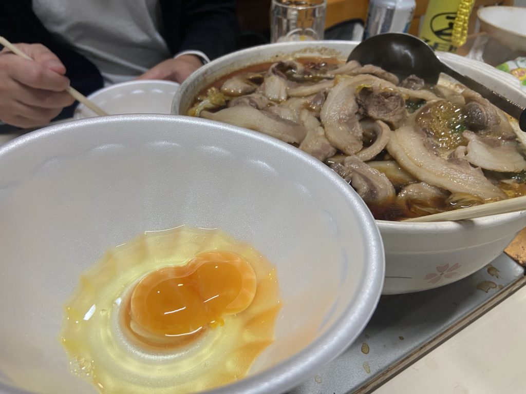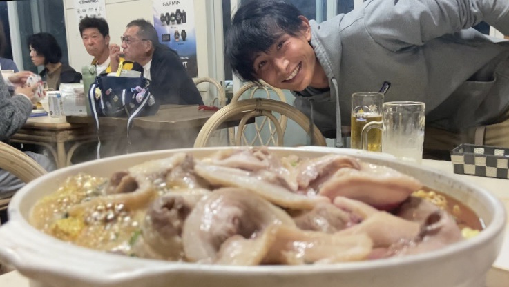 初日のワイド撮影を終えて、温泉を堪能して、夕食はなんと、しし鍋~!(双子卵は私が割った卵から出てきました!)